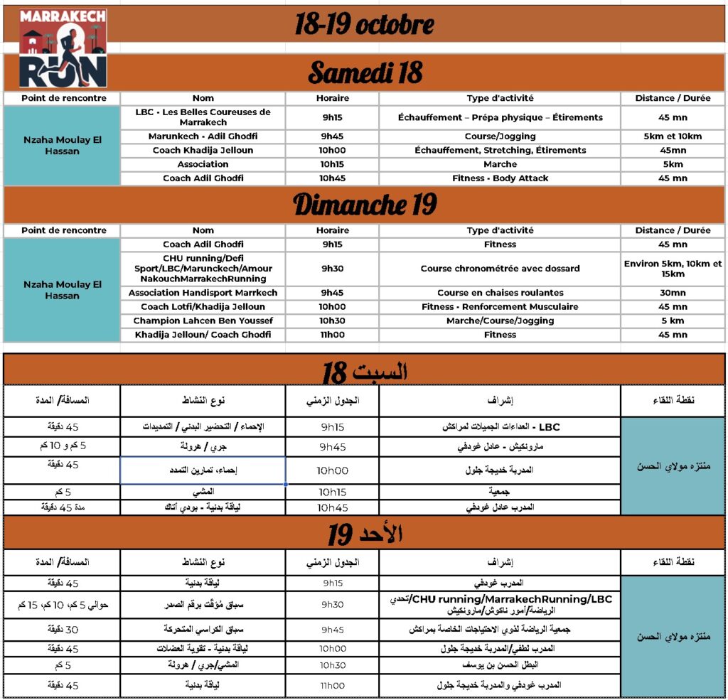 MarrakechRun célèbre la ville de Marrakech et ses sportifs. Nous invitons tous le monde à se joindre à nous pour faire du sport et découvrir la ville, tout en échangeant avec la communauté de sportifs locaux. La communauté sportive de Marrakech se mobilise pour encourager tout le monde à pratiquer une activité physique. Au programme, plusieurs activités seront proposées : course, marche et fitness. Rejoignez-nous pour un week-end de sport et de convivialité !