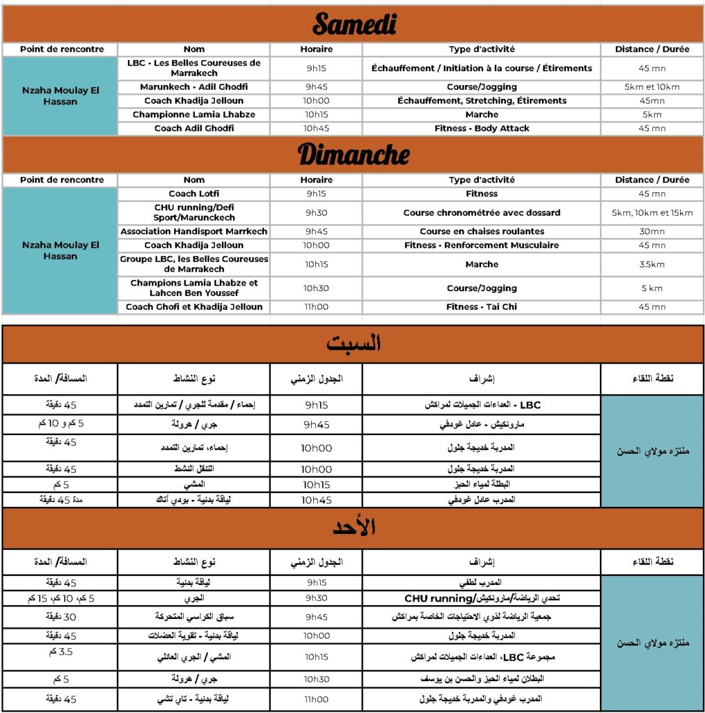 MarrakechRun célèbre la ville de Marrakech et ses sportifs. Nous invitons tous le monde à se joindre à nous pour faire du sport et découvrir la ville, tout en échangeant avec la communauté de sportifs locaux. La communauté sportive de Marrakech se mobilise pour encourager tout le monde à pratiquer une activité physique. Au programme, plusieurs activités seront proposées : course, marche et fitness. Rejoignez-nous pour un week-end de sport et de convivialité !